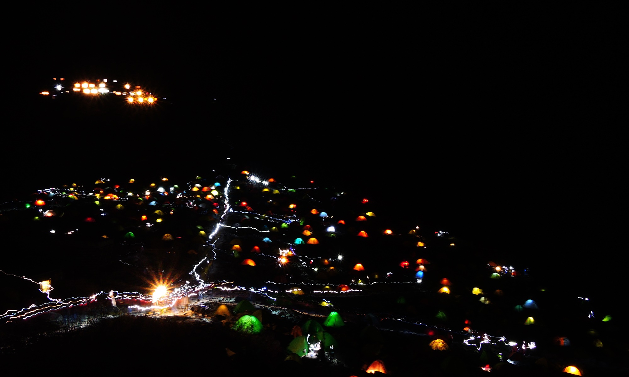 テント1つ1つの明かりが色とりどりでとても綺麗。数が多いからこそ見れる光景ですね。この光景を撮ろうと展望デッキにはたくさんの人がカメラを構えておりました。奥に輝やいているのは涸沢小屋。