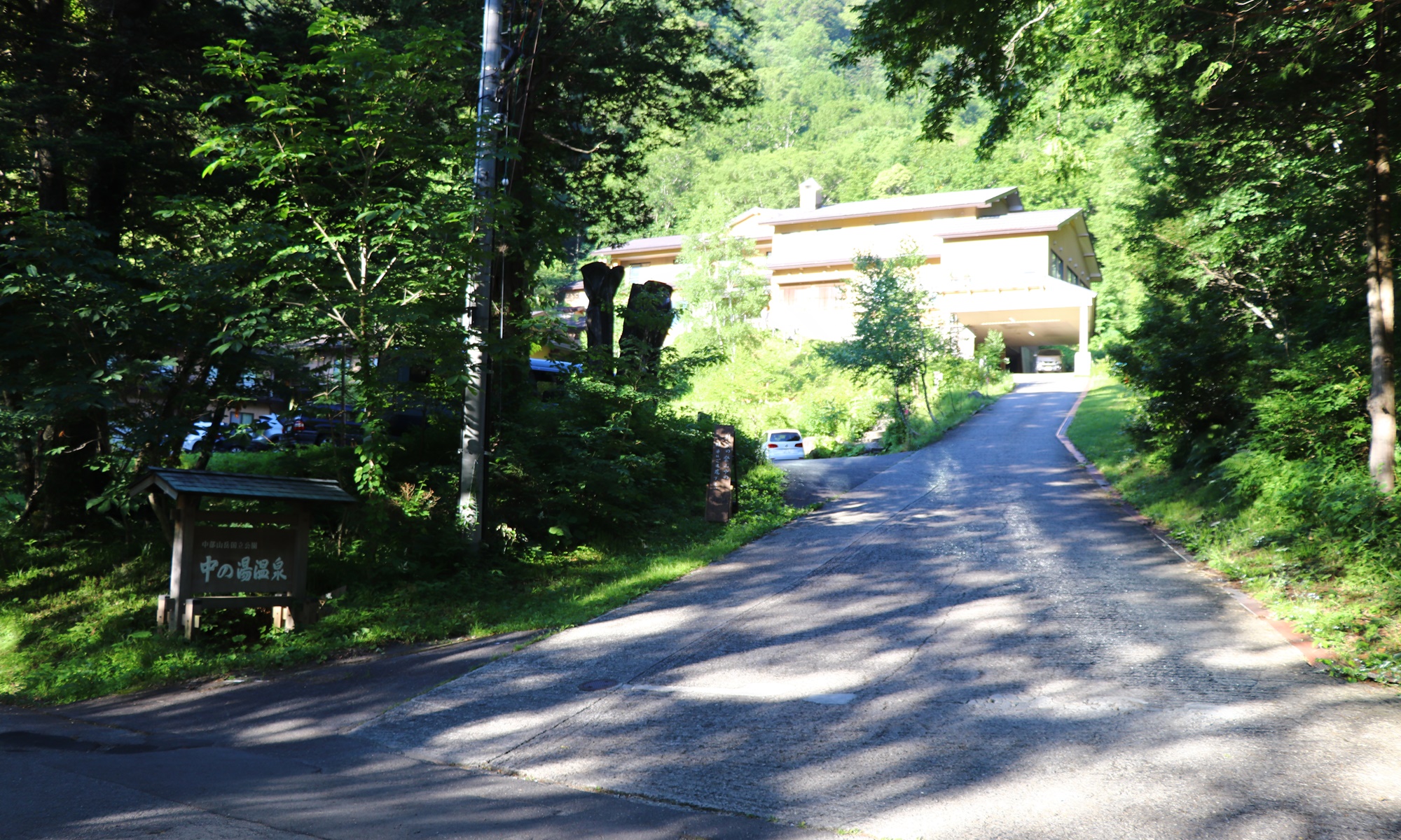 中の湯温泉まで来れば登山口まではあと少しです。この時、私たちは気付いていなかったのですが、温泉の裏に登山口までのショートカットがあったみたい。登る予定の方は別途調べてみて下さい。