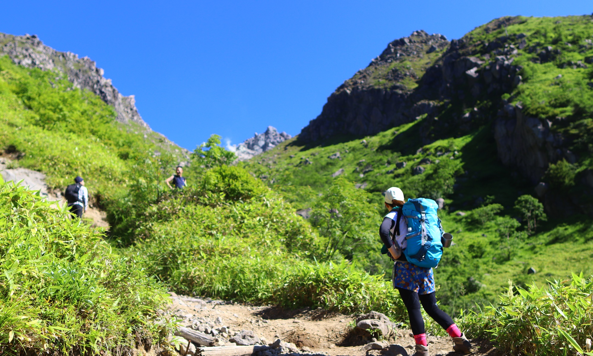 焼岳山頂や活火山の白い煙がよく見えます。みんなここで写真撮影して休憩していましたが、一息入れるのにスペース的にもタイミング的にも景観的にも絶好のポイントです。