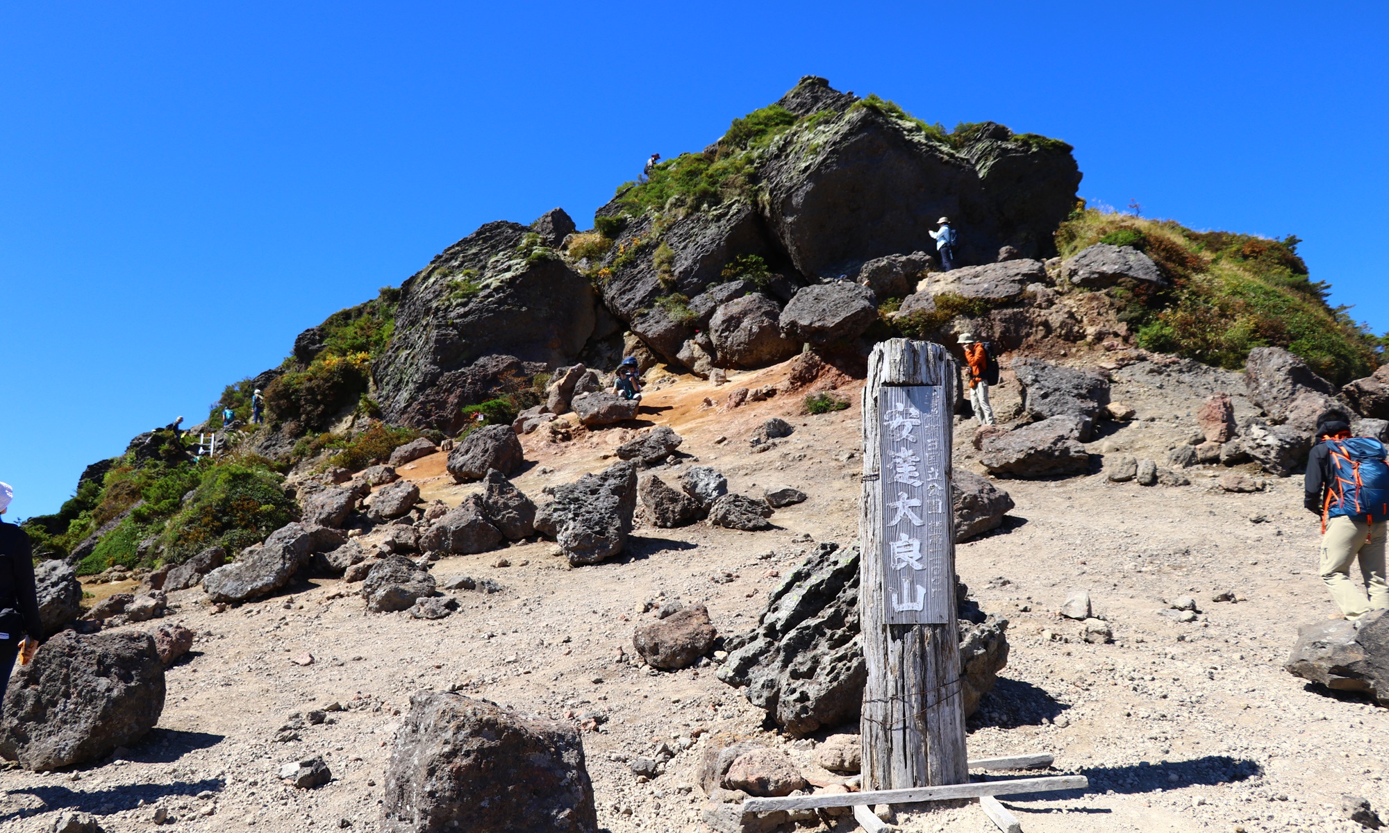 山頂までの道のりも後半になると視界は開けてきて、登りもなだらかで気持ちのいいコースとなります。やはりこうしてみると人が多いですね。そういえば私と同じように子供を背負っている人が多かったのも印象的。抱っこ紐(前抱っこ)で登っている人がいたのは驚きでした。