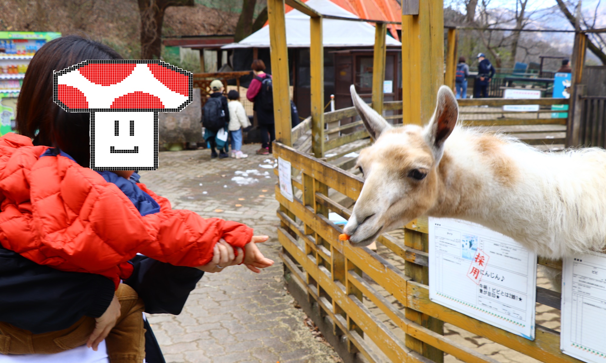 入園してすぐのケージにはラマとヤギがいました。ちびキノコは生まれて初めての動物園。ラマをみて怖がるかと思いましたが、自分で駆け寄っていって、むしろ叩いたり毛を引っ張ったりするんじゃないかと逆にドキドキしました。エサやりも臆さずにできていました。