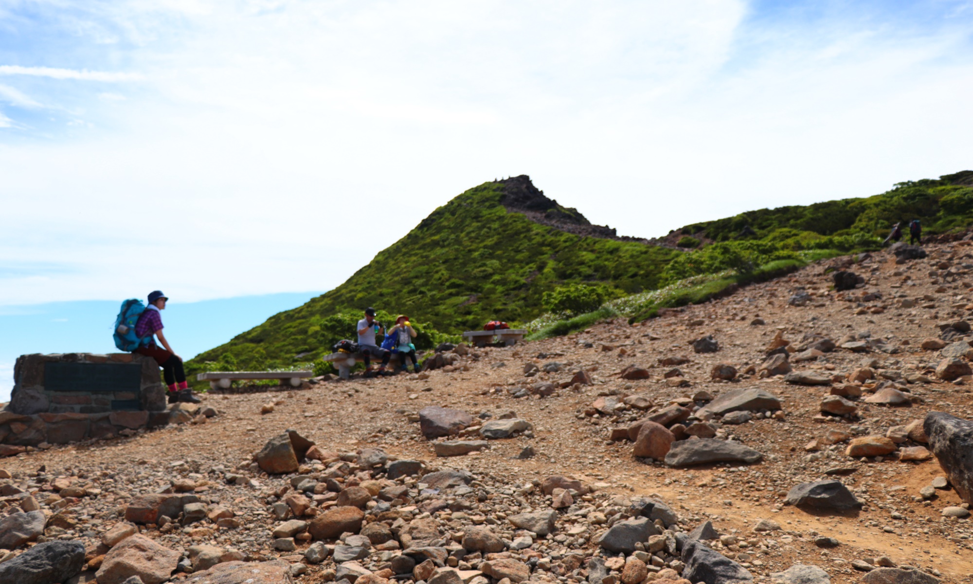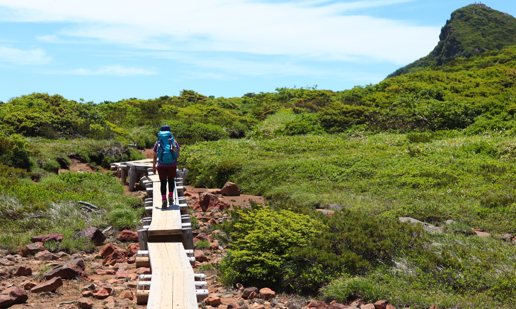 朝日岳までの道は岩が転がってたり、ゴツゴツとした感じです。まだ8時過ぎだったからか、人はそこまで多くありませんでした。