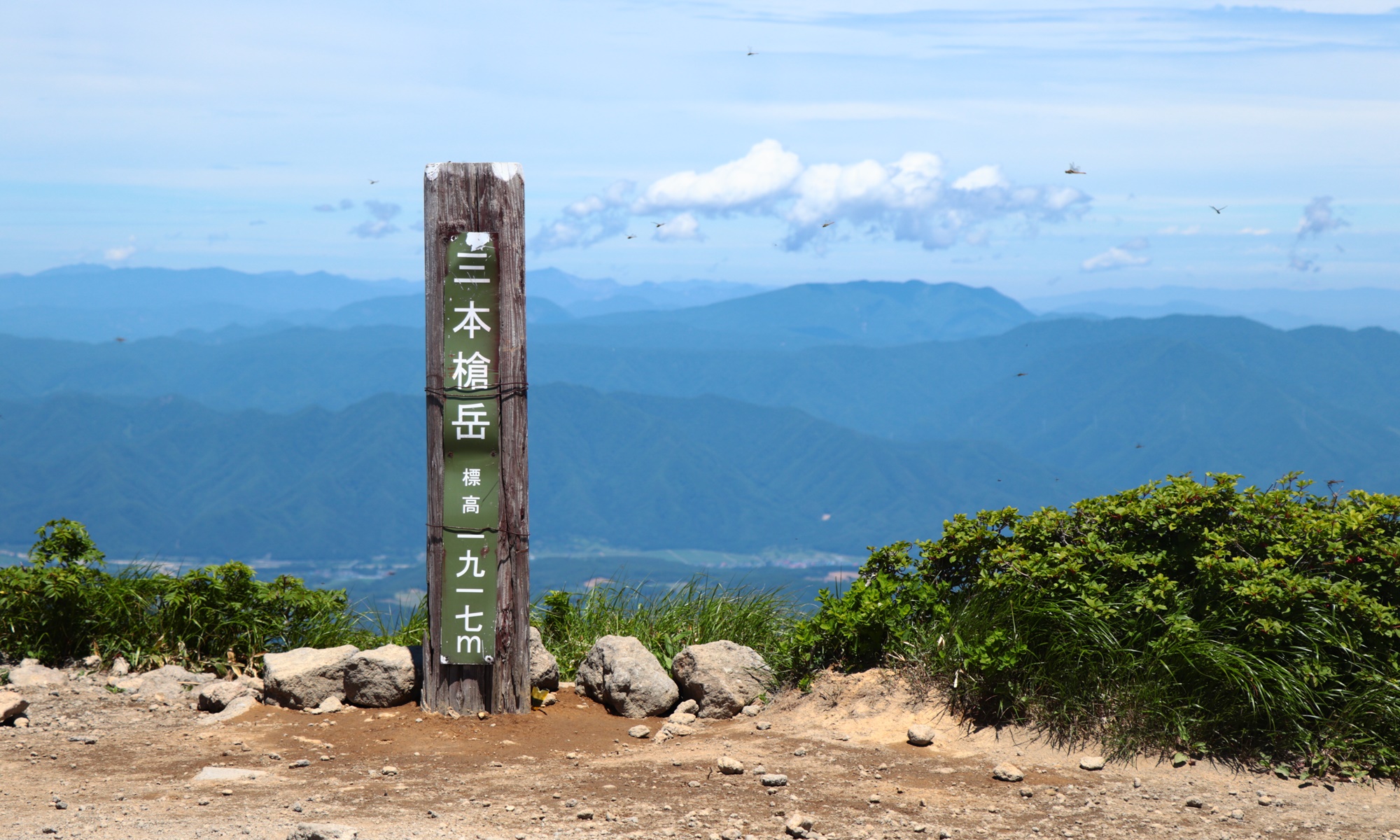 最後と思われる坂を登ってようやく到着。(やっぱりこれが三本槍岳だったんや…!!)ちなみに三本槍岳の名前の由来は、昔3つのグループの代表兵士が「ここは我々の領地だ!」と槍を大地に刺して言い合いしてたからとか、そんな感じらしいです。(間違っていたらすいません)朝日岳から三本槍岳の工程は疲れました。いやしかしこの写真はトンボがよく撮れていますね(笑)