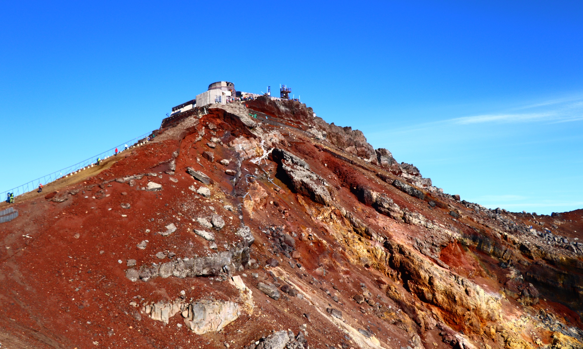 20分くらい?列に並んでようやく山頂。標高日本一を誇る富士山山頂、3,776mです。きのこばっかりですね。これがまた残念なことに逆光でした。せっかくの山頂なのに無念。後ろの行列もあるので後ろの方に写真を撮ってもらいました。(直前の人がシャッターを押すような暗黙の了解感を感じました。)