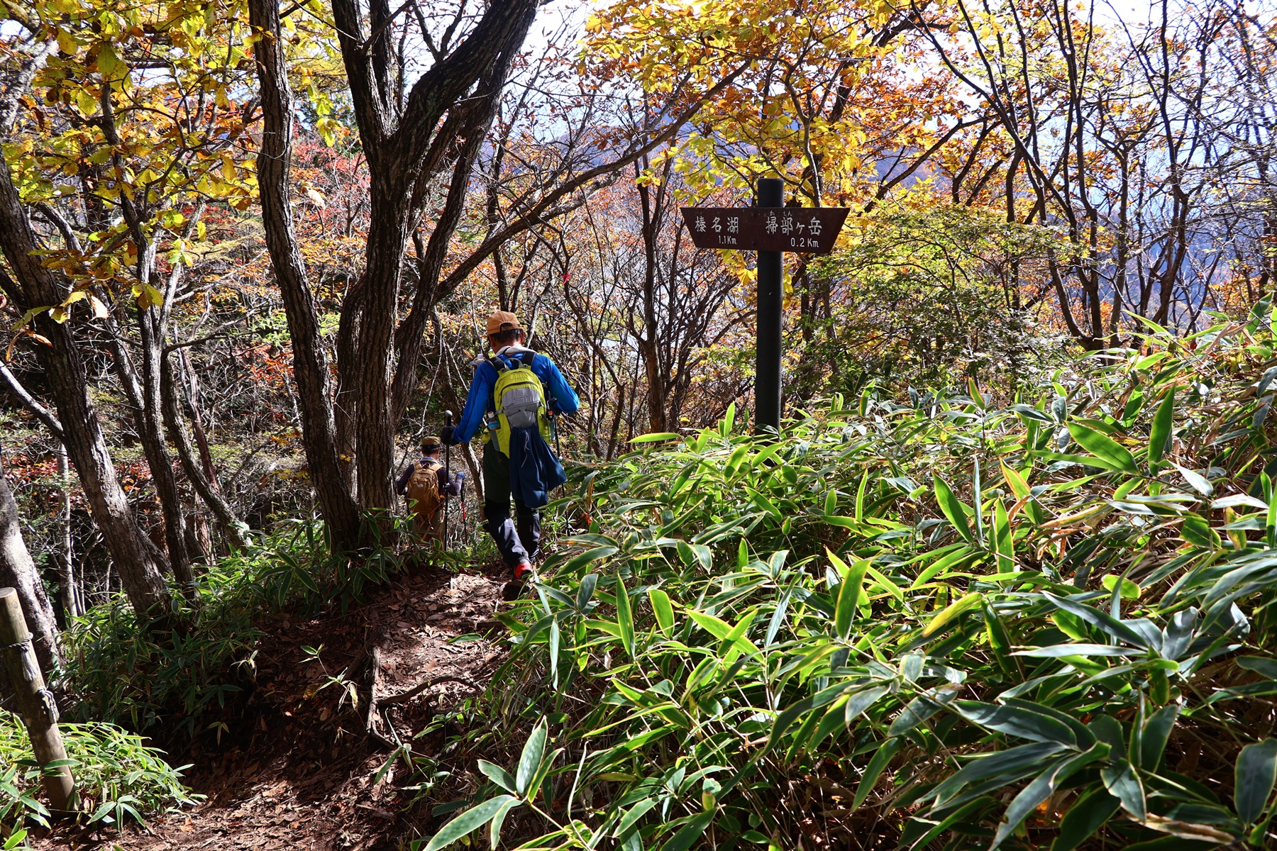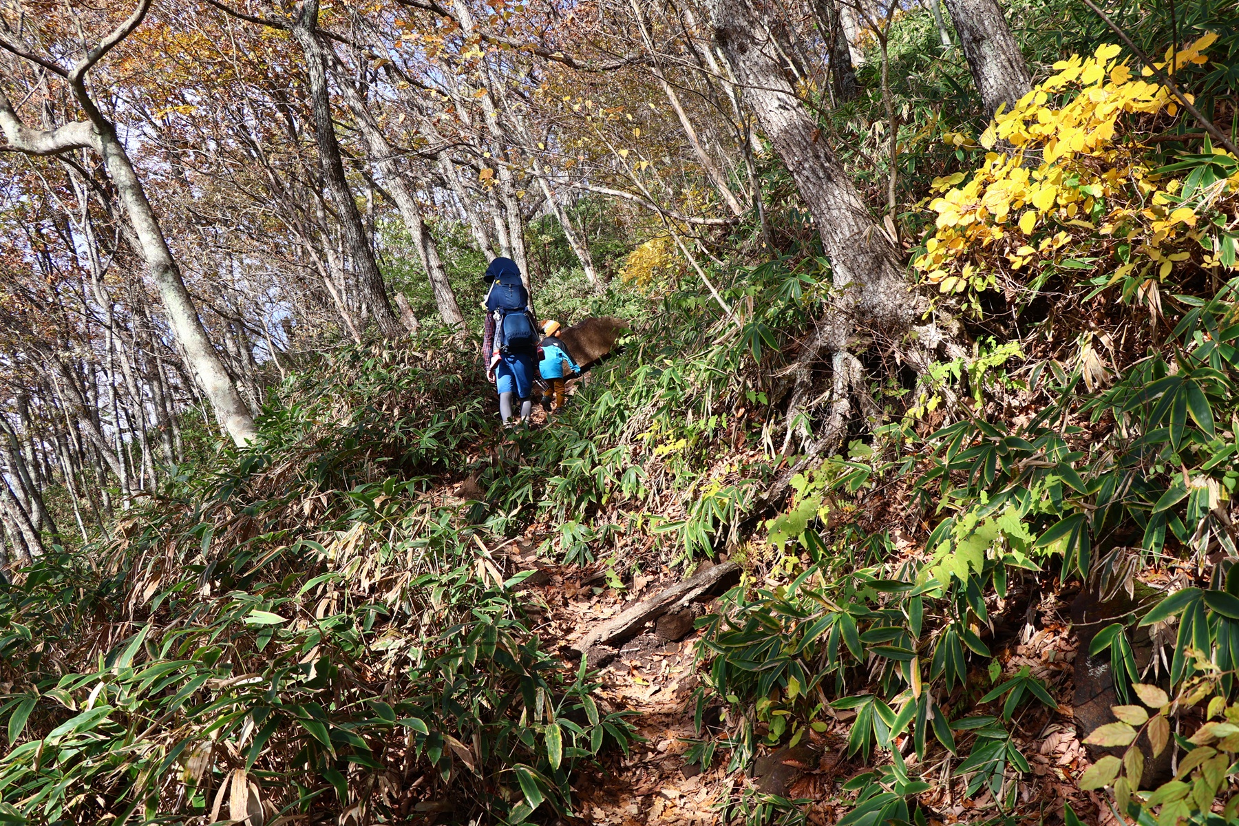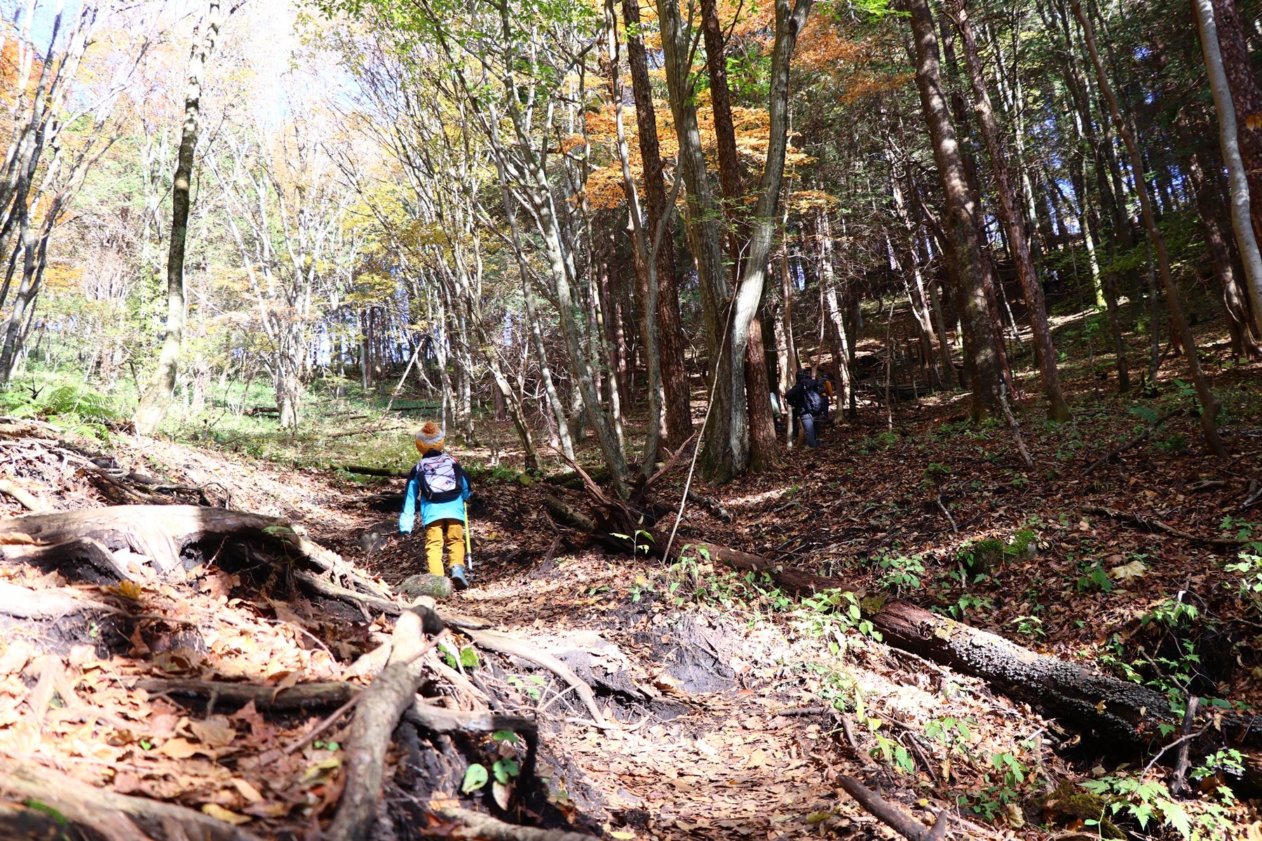 木々の間から射す太陽の光が暖かく、いい感じで葉っぱたちを照らしてくれます。序盤は緩やかな上り坂。